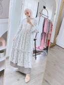 Desain midi dress chic nan cantik dengan detail ruffle keliling bikin makin cantik ala-ala design classic yang elegant, dengan efek oversize tapi gak kliatan kebesaran.